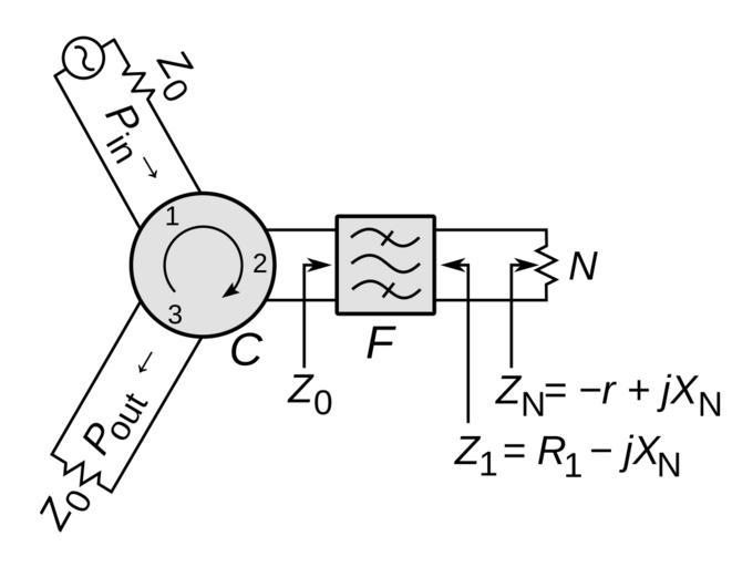 Keywords: Reflection amplifier.svg reflection amplifier which uses a negative resistance diode such as a tunnel diode Gunn diode or IMPATT diode to provide gain A one-port negative resistance device like a diode can amplify but the amplified output signal must pass out of the device through the same pair of terminals as the input signal passes in so without some way of separating the signals the amplifier can suffer from feedback problems The reflection amplifier uses a nonreciprocal device called a circulator to separate the signals The circulator C is a solid state component with three ports which passes signals in circular order; a signal applied to port 1 is sent to port 2 and similarly 2 to 3 and 3 to 1 In this reflection amplifier the input signal P<sub>in</sub> is applied to port 1 a DC-biased negative resistance diode N is attached to port 2 through a filter F and the output P<sub>out</sub> taken from port 3 The input signal is sent from port 1 to the diode at port 2 but the returning amplified signal from the diode is routed to port 3 so there is little coupling from output to input The purpose of the filter F is to present the correct impedance to the diode which determines the amplifier's gain Since diodes have significant reactance capacitance X<sub>N</sub> at high frequencies the filter also cancels this reactance with a conjugate reactance to prevent reflections 2014-07-30 17 36 03 own Chetvorno cc-zero Uploaded with UploadWizard SVG electricity Circulator circuits Negative resistance |
