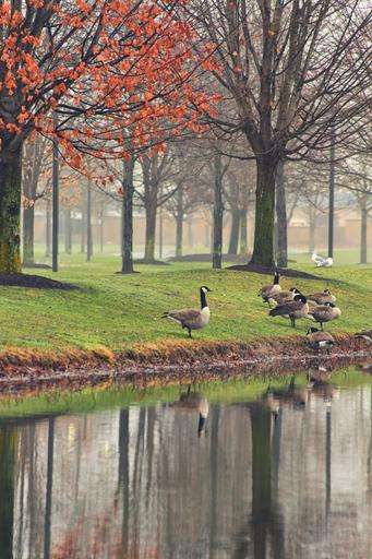 Keywords: reflection by the water geese water lake nature landscape park autumn pond calm outdoors season tree green bird colorful natural fog animal feather wild wildlife wing birdlife