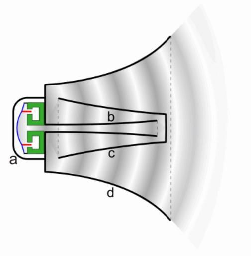 | Keywords: Reflex loudspeaker animation 2.gif folded horn speaker widely used in public address systems It consists of a specialized diaphragm loudspeaker called a compression driver a attached to a metal or plastic horn d The driver has a small metal diaphragm <font color blue > blue </font> driven to vibrate by the audio signal current flowing through a coil of wire <font color red > red </font> between the poles of a cylindrical magnet <font color green > green </font> The horn serves to couple the diaphragm more efficiently to the air allowing it to radiate more of its energy as sound than a conventional horn speaker making it louder The horn sound path must be several feet long so to make the speaker more compact the sound path is folded into a zigzag shape by several concentric exponentially-widening ducts The sound waves pass forward through an inner tube b in the central projection in the horn back through a larger concentric tube c then out through the surrounding horn d <br /><br /> Reentrant loudspeakers can be 10 times as efficient as cone loudspeakers and so their output can be 10 dB louder when operating from the same amplifier However their frequency response is very uneven and limited with a bandwidth of 300-400 Hz to 5 kHz so they have a distinctive tinny sound and are only used for the human voice <br /><br /> In this animation the rate of vibration of the diaphragm and the speed of the sound waves are shown greatly reduced 2013-03-02 17 45 33 own Chetvorno This is an improved version of my previous animation Reflex loudspeaker animation gif Improvements Made speaker horn closer to shape of actual bullhorn showed sound waves radiating from mouth Increased speed of animation to more realistically represent speaker vibrations Increased wavelength to more realistically represent actual sound waves in speaker; previous waves were in ultrasonic range cc-zero Uploaded with UploadWizard Horn speakers Public address speakers Loudspeaker schematics Animated diagrams |