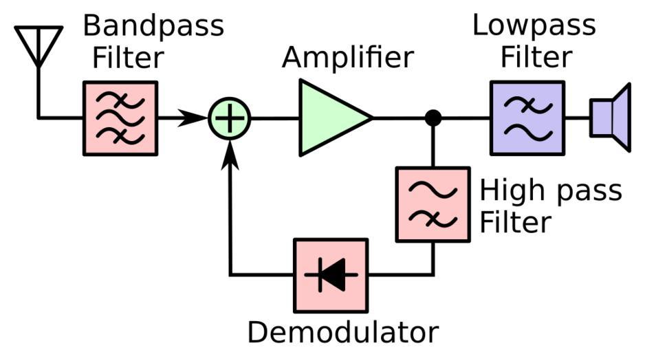 | Keywords: Reflex receiver block diagram.svg reflex radio receiver an unusual type of radio receiver invented by Marius Latour and William Preiss in 1917 that was used to a limited extent in the 1920s The distinguishing feature of the reflex circuit is that the amplifier is used to amplify both the radio frequency RF and audio frequency AF signals at the same time It functions as a tuned radio frequency TRF receiver The RF signal from the antenna after passing through the bandpass filter a tuned circuit which selects the frequency of the station desired passes through an amplifier consisting of one or more vacuum tubes or transistors then passes through the high pass filter to the demodulator which extracts the information bearing modulation audio signal from the radio carrier wave This is fed back and passes through the same amplifier again which does the audio amplification passes through the lowpass filter which blocks the RF signal and is applied to the speaker Thus the amplifying devices do double duty reducing the number of active devices needed The economical reflex circuit was used in inexpensive single vacuum tube receivers in the early 1920s but feedback problems limited its usefulness 2016-01-07 own Chetvorno other versions cc-zero Receivers Uploaded with UploadWizard Reflex receiver circuits |