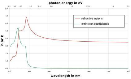 | Keywords: Refractive index of silicon (300 K).svg en Wavelength dependet complex refractive index N n + ik of crystaline silicon in the NIR VIS an UV region at 300 K Data based on Palik Edward D ; Ghosh Gorachand Handbook of optical constants of solids San Diego Academic Press 1998 “ ISBN 0125444206 de Darstellung der wellenlängenabhängigen komplexen Brechzahl N n + ik von Silizium im NIR-VIS-UV-Bereich bei 300 K Daten basieren auf den Angaben in Palik Edward D ; Ghosh Gorachand Handbook of optical constants of solids San Diego Academic Press 1998 “ ISBN 0125444206 own Cepheiden 2007-06-19 file Komplexe_Brechzahl_von_Silicium_ 300_K svg Silicon spectra Refractive index plots |