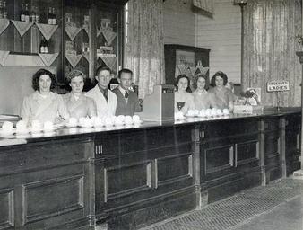 | Keywords: archives state records nsw staterecordsnsw newsouthwales blackandwhite narrabri new england newengland refreshment room refreshmentroom tea room tearoom cafe staff waitresses women uniforms black and white Narrabri Railway Refreshment Room - interior showing staff behind counter Dated: 19/07/1951 Digital ID: 17420_a014_a014000075 Rights: www.records.nsw.gov.au/about-us/rights-and-permissions We'd love to hear from you if you use our photos. Many other photos in our collection are available to view and browse on our website using Photo Investigator. Narrabri Railway Refreshment Room - interior showing staff behind counter Dated: 19/07/1951 Digital ID: 17420_a014_a014000075 Rights: www.records.nsw.gov.au/about-us/rights-and-permissions We'd love to hear from you if you use our photos. Many other photos in our collection are available to view and browse on our website using Photo Investigator. |