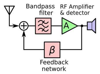 | Keywords: Regenerative receiver block diagram.svg regenerative radio receiver a type of radio receiver widely used before World War 2 It consists of a tuned circuit that serves as a bandpass filter to select the desired radio signal out of all the signals picked up by the antenna and a combined amplifier-detector to increase the power of the signal and extract the audio modulation sound signal from from the radio carrier wave The distinctive feature of the regenerative receiver is that the gain of the amplifier is increased by regeneration positive feedback ; the signal from the output of the amplifier is fed back into the bandpass filter by a feedback loop This also decreases the bandwidth of the receiver 2016-01-05 own Chetvorno other versions cc-zero Radio receivers Regenerative circuits Uploaded with UploadWizard |