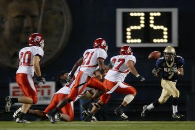 | Keywords: Reggie Campbell catches pitch at 2007 Poinsettia Bowl 071220-N-0555B-025.jpg Navy running back Reggie Campbell 7 a senior from Sanford Fla prepares to catch a pitch from quarterback Kaipo-Noa Keheaku-Enhada 10 The Midshipmen of the Naval Academy met the University of Utah Utes in the third-annual Poinsettia Bowl ending with a 35-32 Utah victory http //www navy mil/view_image asp id 54192 2007-12-20 Mass Communication Specialist 2nd Class Christopher D Blachly USN PD-USGov-Military-Navy Files by User BrokenSphere 2007 Poinsettia Bowl 25 number |