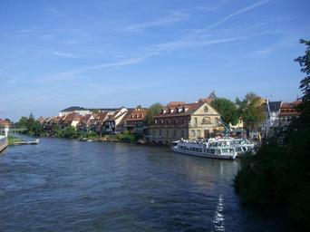 Keywords: regnitz river small venice row of houses ship shipping water bamberg town on the river sky blue mirroring homes building