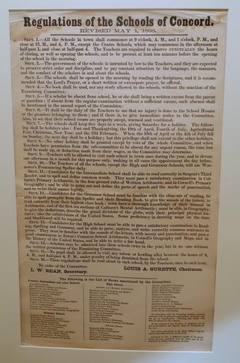 | Keywords: Regulations of the Schools of Concord, Boston, 1866, paper - Concord Museum - Concord, MA - DSC05608.JPG en Exhibit in the Concord Museum Concord Massachusetts USA 2014-12-30 13 26 07 own Daderot other versions PD-old-100 cc-zero Childhood exhibits in the Concord Museum History of education 1866 documents 1866 in Massachusetts | ||||