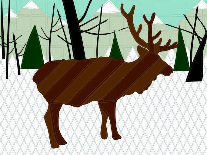 Keywords: reindeer deer snow tree sky quilt brown green white blue grey mountain peak antler strip branch winter cold animal