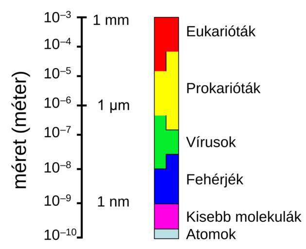Keywords: Relative scale hu.svg Relative scales of eukaryotes prokaryotes viruses proteins and atoms Az eukarióták prokarióták vírusok fehérjék és atomok mérettartományai egymáshoz viszonyítva <br> Created with Inkscape Image Relative_scale svg 2006-12-30 Created by Peter Budai vectorized by Fvasconcellos left thumb English version Biology diagrams Hungarian text |