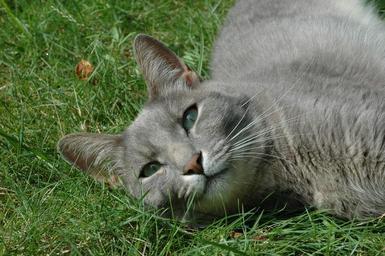 Keywords: relaxing feline cat resting domestic grass eye contact