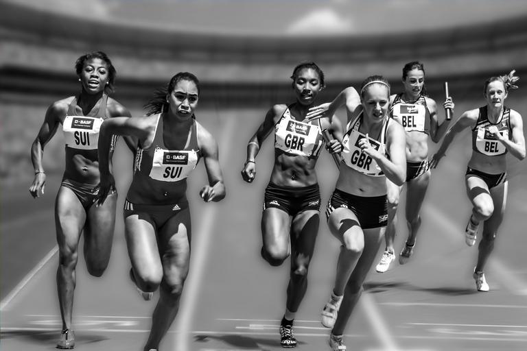 Keywords: relay race competition stadium sport run athletics black and white