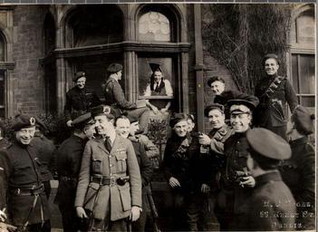 | Keywords: london and north western hotel londonandnorthwesternhotel north wall northwall dublin ireland leinster black and tans blackandtans auxiliaries auxies damage broken windows brokenwindows irish war of independence irishwarofindependence i.r.a. ira irish republican army irishrepublicanarmy uniforms berets pistols belts goggles caps crests april 1921 1920s twenties hogan-wilson collection hoganwilsoncollection dúchrónaigh cogadh na saoirse cogadhnasaoirse q company qcompany w.d. hogan wdhogan hogan collection hogancollection national library of ireland nationallibraryofireland people monochrome This shot of joking Black and Tans and Auxiliaries was taken outside the London and North Western Hotel, North Wall, Dublin as they surveyed the damage after an I.R.A. attack on their quarters. Written on the mount of this photo was "Tans glad to have escaped the bombs thrown at their headquarters in Dublin". The next day's Irish Times started a long report with these paragraphs: "... the hotel, which is at present occupied by Auxiliary police, was attacked shortly before eight o'clock yesterday morning by a party of men with bombs and rifles. The police returned the fire, and one of the attackers was seriously wounded and has since been taken to George V. Hospital. Two other men were also wounded and are now patients in the Mater Hospital. Another account from an authoritative source says that twelve bombs were thrown at the windows of the hotel, which is occupied by members of the Auxiliary police force employed on duty at the docks. Six men fired revolvers at the windows. Fire was returned by the police and one man was killed in the act of throwing a bomb, and one cadet was slightly wounded..." Date: Monday, 11 April 1921 NLI Ref.: HOGW 117 This shot of joking Black and Tans and Auxiliaries was taken outside the London and North Western Hotel, North Wall, Dublin as they surveyed the damage after an I.R.A. attack on their quarters. Written on the mount of this photo was "Tans glad to have escaped the bombs thrown at their headquarters in Dublin". The next day's Irish Times started a long report with these paragraphs: "... the hotel, which is at present occupied by Auxiliary police, was attacked shortly before eight o'clock yesterday morning by a party of men with bombs and rifles. The police returned the fire, and one of the attackers was seriously wounded and has since been taken to George V. Hospital. Two other men were also wounded and are now patients in the Mater Hospital. Another account from an authoritative source says that twelve bombs were thrown at the windows of the hotel, which is occupied by members of the Auxiliary police force employed on duty at the docks. Six men fired revolvers at the windows. Fire was returned by the police and one man was killed in the act of throwing a bomb, and one cadet was slightly wounded..." Date: Monday, 11 April 1921 NLI Ref.: HOGW 117 |