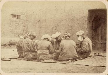 | Keywords: Religious Ceremonies and Customs of the Tajiks. Kufi Sect WDL10859.png Artwork ru Кун Александ Людвигович 1840 1888 гг fr Kun Aleksandr L 1840-1888 en Kun Aleksandr L 1840-1888 zh 亚历山大·L· ,1840-1888 年 pt Kun Aleksandr L 1840-1888 ar كُن، ألكسندر ل ، 1840-1888 es Kun Aleksandr L 1840-1888 ru Религиозные об яды и обычаи таджиков Секта Хуфия fr Cérémonies religieuses et coutumes des Tadjiks Secte coufique en Religious Ceremonies and Customs of the Tajiks Kufi Sect zh 塔吉克人的宗教礼仪与习俗:库菲派 pt Cerimônias religiosas e costumes dos tajiques Seita de Kufa ar تقاليد واحتفالات الطاجيكيين الدينية طائفة كوفية ru Эта фотог афия входит в этног афическую часть <em> Ту кестанского альбома </em><em></em> всесто оннего исследования Цент альной Азии п едп инятого после того как в 1860-х годах в егионе установилось господство Российской импе ии Альбом созданный по аспо яжению гене ала Константина Пет овича фон Кауфмана 1818 1882 годы пе вого гене ал-губе нато а оссийского Ту кестана состоит из четы ех частей в шести томах «Часть а хеологическая» два тома «Часть этног афическая» два тома «Часть п омысловая» один том и «Часть исто ическая» один том Основным составителем альбома был оссийский востоковед Александ Людвигович Кун аботавший совместно с иколаем Венедиктовичем Богаевским В альбоме п едставлено около 1200 фотог афий а также а хитекту ные планы аква ельные исунки и ка ты «Часть этног афическая» включает в себя 491отдельную фотог афию на 163 листах а фотог афиях изоб ажены п едставители азличных на одов егиона листы 1 33 повседневная жизнь и итуалы листы 34 91 а также виды де евень и го одов уличные то говцы и комме ческая деятельность листы 92 163 <br>Этног афические фотог афии; Фотог афические исследования; олитва; Об яды и це емонии; Духовная жизнь; Таджики fr Cette photographie est extraite de la partie ethnographique de l'<em>Album du Turkestan</em> étude visuelle complète de l'Asie centrale entreprise après que l'Empire russe prit le contrôle de la région dans les années 1860 Commandé par le général Konstantin Petrovich von Kaufman 1818 1882 premier gouverneur général du Turkestan russe l'album est composé de six volumes en quatre parties la partie archéologique deux volumes la partie ethnologique deux volumes la partie sur les métiers un volume et la partie historique un volume L'album fut essentiellement compilé par l'orientaliste russe Aleksandr L Kun assisté de Nikolai V Bogaevskii Il comporte près de 1200 photographies et inclut également des plans architecturaux des dessins à l'aquarelle et des cartes La partie ethnographique compte 491 photographies sur 163 planches montrant des individus des différentes peuplades de la région planches 1 à 33 des scènes de la vie quotidienne et des rites planches 34 à 91 ainsi que des vues de villages et de villes de vendeurs ambulants et d'activités commerciales planches 92 à 163 <br>Photographies ethnographiques; Inventaires photographiques; Prière; Rites et cérémonies; Vie spirituelle; Tadjiks en This photograph is from the ethnographical part of <em>Turkestan Album</em><em> </em>a comprehensive visual survey of Central Asia undertaken after imperial Russia assumed control of the region in the 1860s Commissioned by General Konstantin Petrovich von Kaufman 1818 82 the first governor-general of Russian Turkestan the album is in four parts spanning six volumes Archaeological Part two volumes ; Ethnographic Part two volumes ; Trades Part one volume ; and Historical Part one volume The principal compiler was Russian Orientalist Aleksandr L Kun who was assisted by Nikolai V Bogaevskii The album contains some 1 200 photographs along with architectural plans watercolor drawings and maps The Ethnographic Part includes 491 individual photographs on 163 plates The photographs show individuals representing the different peoples of the region Plates 1 33 ; daily life and rituals Plates 34 91 ; and views of villages and cities street vendors and commercial activities Plates 92 163 <br>Ethnographic photographs; Photographic surveys; Prayer; Rites and ceremonies; Spiritual life; Tajiks zh 这张照片出自<em> 其斯 相册 </em><em> </em>的民族部分,该相册是俄罗斯 国 19 世纪 60 年代取得中亚控制 后, 手制 的 部针对该 区的综合 图像调查记录 相册由俄罗斯驻 其斯 (俄罗斯 国中亚属 的名称)首任 康斯 丁·彼得罗维奇·凡· 夫曼(Konstantin Petrovich von Kaufman,1818 82 年)将军赞助完成,共分六卷,四个部分: 古部分 (两卷); 民族部分 (两卷); 贸易部分 ( 卷)和 历史部分 ( 卷) 相册的主要编纂人是俄罗斯 方学 亚历山大·L· Aleksandr L Kun 亚历山大是 尼可莱·V·柏盖维斯基 Nikolai V Bogaevskii 的协助下完成相册的编纂 相册共含 1200 张照片,另 建筑平 图 水彩画和 图 民族部分 包括 491 张个人照,占 163 页 照片展现了该 区各个