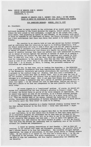 | Keywords: Remarks of Senator John F. Kennedy on the Senate Floor in Reply to Criticism on his Call for Freedom for Algeria July... - NARA - 193187.tif Scope and content Senator John F Kennedy's reply to criticisms to his speech on Algeria which he delivered on the senate floor July 2 1957 General notes 193187 Local identifier Kennedy John F John Fitzgerald 1917-1963 John F Kennedy Library NLJFK Columbia Point Boston MA 02125-3398 1957-07-08 Record group Collection JFK-KPREP John F Kennedy Pre-presidential Papers 1946 - 1960 Record group ARC 1160 John F Kennedy Pre-presidential Papers; Senate Files; Speeches and the Press compiled 1953 - 1960 Series ARC 193146 File unit John F Kennedy Pre-presidential Papers; Senate Files; Speeches and the Press; Press Releases 04/30/1957 - 07/22/1957 04/30/1957 - 07/22/1957 File unit ARC 193186 Variant control numbers NAIL Control Number NLK-KPREP-SENATESPCHP-PR043057072257-5DDDZ yes Other versions NARA-cooperation PD-USGov Documents related to John F Kennedy Algeria since the independence |