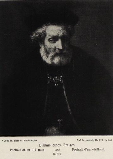 | Keywords: Rembrandt - Portrait of an old man with beard and beret - Schloss Rohoncz.jpg Artwork Q21888081 1667 oil on panel 70 x 58 cm private collection https //archive org/stream/gri_33125004476327 page/n556/mode/1up Creator Rembrandt PD-Art-100 Paintings by Rembrandt 1667 paintings Male portraits by Rembrandt |