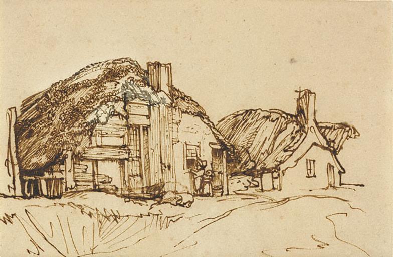 View Original:rembrandt_two_thatched_cottages_with_figures_window.jpg (640x418)