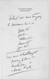 | Keywords: Reminder Notes, Things to Do January 21, 1963 - NARA - 192812.tif Scope and content Notes of the President mostly on Foreign Policy matters General notes 192812 Local identifier Kennedy John F John Fitzgerald 1917-1963 NARA-Place Africa 4179013 <br /> Canada North and Central America nation 4188341 60 -96 <br /> Europe 3136488 <br /> France Europe nation 3136736 46 2 <br /> Italy Europe nation 3136808 42 833 12 833 <br /> Japan Asia nation 3137128 36 138 <br /> Turkey Asia nation 3137413 39 35 <br /> John F Kennedy Library NLJFK Columbia Point Boston MA 02125-3398 1963-01-21 Record group Collection JFK-JFKPP John F Kennedy Personal Papers 1917 - 1963 Record group ARC 1158 John F Kennedy Personal Papers Doodles compiled 1952 - 11/22/1963 Series ARC 192764 File unit John F Kennedy Personal Papers Doodles 1963; KP1 - KP7 01/01/1963 - 01/22/1963 File unit ARC 192811 Variant control numbers NAIL Control Number NLK-JFKPP-DOODLES-1963KP1TOKP7-1963KP6NOTES yes Other versions NARA-cooperation PD-USGov Documents related to John F Kennedy To do lists |
