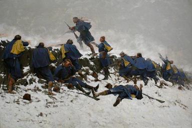 | Keywords: Remington Through the Smoke Sprang the Daring Soldier 1897.jpg Through the Smoke Sprang the Daring Soldier oil on canvas Amon Carter Museum 1961 243 depicting a fight between US soldiers and a band of Northern Cheyenne in Northwestern Nebraska in January 1890 own photo User FA2010 2009 10 1897 Creator Frederic Remington The painting is in the Public Domain due to age The photograph has been dedicated to the Public Domain by the photographer Works by Frederic Remington in the Amon Carter Museum Paintings in the Amon Carter Museum 1897 paintings Paintings of battles Snow in art 1890 events |