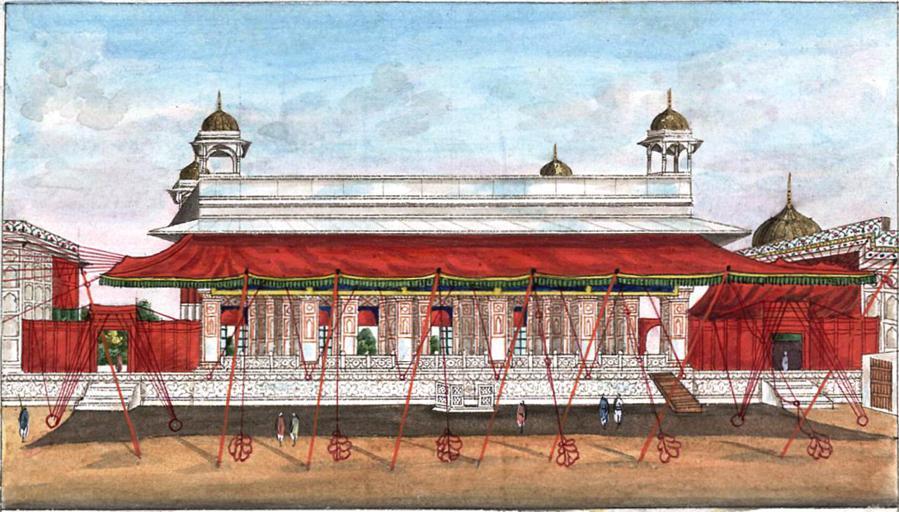 | Keywords: Reminiscences of Imperial Delhi The Diwan-i Khass from the west.png The Dewan-e-Khafs or Audience Hall for the Nobility was constructed by the Emperor Shah Juhan by whom the Royal Palace was also built It is situated at the upper end of a spacious Square elevated upon a Terrace of white Marble about four Feet in height The Dewan-e-Khafs in former times was adorned with Excessive Magnificence and though plundered by Nadir Shah the King of Persia during his invasion in 1738/9 and subsequently mutilated by the Barbarous Hordes of Mahrattas during the later end of the past and beginning of the present Century still retains sufficient Beauty to render it the object of Admiration The dimensions are said to be 150 feet in length by 40 in breadth The roof is flat supported by numerous Columns of white Marble richly ornamented with inlaid flower Work of different coloured Stones chiefly Cornelian The Cornices and Borders being decorated with Frieze and Sculptured work The Cieling sic was formerly incrusted with a rich Foliage of Gold and Silver Work throughout its whole Extent This during the Period of Anarchy was removed and an imitation Ceiling which still exists substituted In the interior of the Building and in the Cornice are the following lines written in the Persian Character in letters of Gold In Persian agar firdaus bar rui zamin ast hamin ast va hamin ast va hamin ast Ugur Firdoce bur Rooe Zumeen ust Humeen usto Humeen usto Humeen ust If there be a Paradise upon Earth It is this It is this It is this The Diwan-i Khass from the west with canopies and screens The Red Fort was commissioned by Shah Jahan r 1627-58 in 1639 it took nine years to build and was the seat of the Mughal power until 1857 when Bahadur Shah Zafar the last Mughal emperor was dethroned and exiled Part of the palace complex the Diwan-i-Khas or Hall of Private Audience was where the emperor would consult with his advisors and meet important visitors The hall was built entirely of white marble inlaid with precious stones The hall ™s ceiling was once silver which was removed by the Marathas and the spectacular Peacock throne was taken by Nadir Shah of Persia in 1739 Inscribed naqsha-i divan-i khass andarun-i qil ˜a-i shahjahanabad Mazhar ˜Ali Khan The interior of the Diwan-i Khass with qanats concealing the Khwabgah and the Scales of Justice Inscribed naqsha-i andarun-i divan-i khass dar qil ˜a-i shahjahanabad taraf-i shamal hast ˜amal-i Mazhar ˜Ali Khan From 'Reminiscences of Imperial Delhi ™ an album consisting of 89 folios containing approximately 130 paintings of views of the Mughal and pre-Mughal monuments of Delhi as well as other contemporary material with an accompanying manuscript text written by Sir Thomas Theophilus Metcalfe 1795-1853 the Governor-General ™s Agent at the imperial court Acquired with the assistance of the Heritage Lottery Fund and of the National Art-Collections Fund http //www bl uk/onlinegallery/onlineex/apac/addorimss/t/019addor0005475u00021vrb html 1843 creator Thomas Theophilus Metcalfe PD-old-100 Diwan-i-Khas Red Fort Red Fort in art Reminiscences of Imperial Delhi Thomas Theophilus Metcalfe |