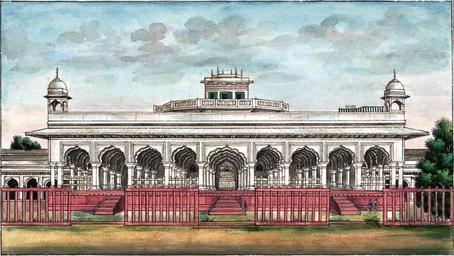 | Keywords: Reminiscences of Imperial Delhi The Diwan-i ‘Am from the west.png s of persons It is situated at the upper end of a spacious square and though at present much neglected is still a noble building The length is 196 feet and breadth 64 feet The roof is supported by a succession of flat arches of red stone on pillars of the same material but now disfigured by the bad taste of modern times with a coating of white plaster On each side of the Hall and all round the square are arcades which are said in former days of splendor to have been adorned with the richest tapestry But in these degenerate times the walls are bare and the buildings themselves used as stables or lumber rooms In the interior of the Dewn e Aum is a massive marble throne handsomely carved and below it a large slab of the same material on which on public days the chief ministers took their stand and handed up petitions to the Emperor This slab was beautifully inlaid with mosaic work all of which has been removed In a recess in the rear of the throne is a gilt doorway through which the Emperor entered The recess is ornamented with mosaic work of the most exquisite workmanship and of which several specimens will be found in the succeeding pages The Dewan e Aum is now never appropriated to its original purposes and indeed is nothing more than a receptacle for all kinds of rubbish Shame to the Ruling Power whether it be the King as immediate or the British Government as Lord Paramount The Diwan-i ˜Am from the west The Diwan-i 'Am is a large pavilion at the centre of the Red Fort for public imperial audiences It is positioned between the public and private parts of the fortress It faces a large open courtyard and behind the back wall lie the private imperial palaces Inscribed naqsha-i divan-i ˜amm andarun-i qil ˜a-i shahjahanabad ˜amal-i Mazhar ˜Ali Khan Closer view of the imperial jharoka in the Diwan-i ˜Am The ornate canopied throne-balcony for the emperor stands at the centre of the back wall It is entirely made of white marble carved and inlayed with precious stones in pietra dura Panels of pietra dura work depicting birds and flowers decorate the wall behind the throne some of these were imported from Italy Inscribed naqsha-i kursi andarun-i divan-i ˜amm ast ˜amal-i Mazhar ˜Ali Khan From 'Reminiscences of Imperial Delhi ™ an album consisting of 89 folios containing approximately 130 paintings of views of the Mughal and pre-Mughal monuments of Delhi as well as other contemporary material with an accompanying manuscript text written by Sir Thomas Theophilus Metcalfe 1795-1853 the Governor-General ™s Agent at the imperial court Acquired with the assistance of the Heritage Lottery Fund and of the National Art-Collections Fund http //www bl uk/onlinegallery/onlineex/apac/addorimss/t/019addor0005475u00036vrb html 1843 creator Thomas Theophilus Metcalfe PD-old-100 Diwan-i-Am Red Fort Red Fort in art Reminiscences of Imperial Delhi Thomas Theophilus Metcalfe |