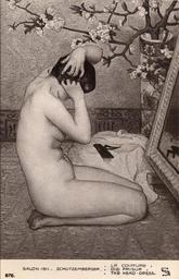 | Keywords: René Schützenberger - La Coiffure CP.jpg Artwork en The Head Dress exhibited at the Salon de de la Société Nationale des Beaux-Arts of 1911 signed on the bottom of the mirror fr La Coiffure exposée au Salon de de la Société Nationale des Beaux-Arts de 1911 signée en bas dans le miroir 1911 Oil on canvas 121 X 91 cm accession number object history credit line Carte postale Salons de Paris ; scan by 9jules9 Image René Schützenberger - Nu à sa coiffure jpg PD-old René Schützenberger Paintings of nude kneeling females Schutzenberger Mirrors in paintings Oil paintings of women 1911 paintings Nude kneeling women in art |