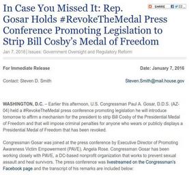 | Keywords: Rep Gosar Holds RevokeTheMedal Press Conference Promoting Legislation to Strip Bill Cosby's Medal of Freedom.jpg In Case You Missed It Rep Gosar Holds RevokeTheMedal Press Conference Promoting Legislation to Strip Bill Cosby ™s Medal of Freedom Jan 7 2016 Issues Government Oversight and Regulatory Reform For Immediate Release Date January 7 2016 Contact Steven D Smith Steven Smith mail house gov WASHINGTON D C “ Earlier this afternoon U S Congressman Paul A Gosar D D S AZ-04 held a RevokeTheMedal press conference promoting legislation he will introduce tomorrow to affirm a mechanism for the president to strip Bill Cosby of the Presidential Medal of Freedom and that will impose criminal penalties for anyone who wears or publicly displays a Presidential Medal of Freedom that has been revoked Congressman Gosar was joined at the press conference by Executive Director of Promoting Awareness Victim Empowerment PAVE Angela Rose Congressman Gosar has been working closely with PAVE a DC-based nonprofit organization that works to prevent sexual assault and heal survivors The press conference was livestreamed on the Congressman ™s Facebook page and the transcript of his remarks are included below 3 00 P M EST - WASHINGTON D C CONGRESSMAN PAUL GOSAR Good afternoon and thank you all for joining us today for this important press conference My name is Paul Gosar and I represent Arizona ™s 4th Congressional district As a member of the House Committee on Oversight and Government reform my colleagues and I have made it our mission to hold the government accountable for its actions From time to time such as this it includes oversight of accolades awarded by the government The Presidential Medal of Freedom was established in 1963 This prestigious award is bestowed on recipients for especially meritorious contributions to the security or national interests of the United States to world peace or to cultural or other significant public or private endeavors The Medal of Freedom is the highest level of honor our country gives to civilians and it is the responsibility of Congress to ensure proper accountability and preserve the integrity of the award William Henry Bill Cosby Jr received the Presidential Medal of Freedom in 2002 Sadly over the past year we have learned from Cosby ™s own admissions that he acted in ways unbecoming of a recipient of the Medal of Freedom Cosby ™s shocking admission in a 2005 deposition where he admitted to drugging women in order to satisfy his sexual desires make him unfit to retain our nation ™s highest civilian honor Court documents obtained by the Associated Press on Monday July 7 2015 revealed that ¦ quoting the New York Daily News ¦ Cosby admitted under oath that he bought Quaaludes to dope the women he wanted to grope ”and slipped the sedative to at least one lady and ˜other people ™ end quote Specifically during the September 29 2005 deposition a lawyer Dolores Troiani asked Cosby quote When you got the Quaaludes was it in your mind that you were going to use these Quaaludes for young women that you wanted to have sex with and Cosby answered Yes end quote To continue honoring Bill Cosby with this prestigious accolade would be an affront to women nationwide particularly those who were victims of his horrific acts Last July when questioned about revoking Cosby ™s medal President Obama stated There's no precedent for revoking a medal ¦We don't have that mechanism Since that time I have been working closely with PAVE and others to craft legislation that provides a mechanism Tomorrow several of my colleagues and I will introduce legislation that ensures there is a mechanism in place to strip Cosby or anyone else found dishonorable of the Medal of Freedom Our legislation imposes criminal penalties for anyone who wears or publicly displays a Presidential Medal of Freedom that has been revoked Now I want to be very clear about one thing It is true that there is a presumption of innocence in the American legal system and rightly so And while our criminal justice system will ultimately determine whether Cosby serves jail time for any of the crimes of which he has been accused Cosby ™s own admissions to drugging women in order to satisfy his sexual desires place him outside the bounds of whom we should admire in our society As one of my constituents Dennis Luis stated eloquently on my Facebook page Civilian honors such as this come with no legal protections or guarantees Honors are optional and not anyone's legal right to have and keep ¦The bar should be extraordinarily high for the Medal of Freedom and to keep Cosby as a recipient greatly diminishes the very worth of that honor Furthermore by allowing Cosby to keep his Medal of Freedom our nation is sending the wrong message to society and future generations And like so many Americans I am sick and tired of watching the rapid decline of our culture right in front of our eyes It is time to reclaim our nation ™s moral compass The Presidential Medal of Freedom is an important symbol of our country It is time for our elected leaders to boldly take a stand for what is right and join together in condemning abhorrent behavior like that of Bill Cosby Revoking Bill Cosby ™s Medal of Freedom won ™t undo his actions or heal the wounds of his victims but it will signal to the American people that we will not tolerate such lewd behavior I am honored to be joined today by Angela Rose Executive Director of PAVE which stands for Promoting Awareness Victim Empowerment PAVE is a national nonprofit organization that does great work in seeking to prevent sexual assault and assist with healing survivors Angela the floors all yours Background The full text of the draft Gosar legislation can be found HERE PAVE ™s press release from 12/17/15 can be found HERE Congressman Gosar has been working on this legislation for months following the release of the 2005 deposition in July 2015 Last July when questioned about 