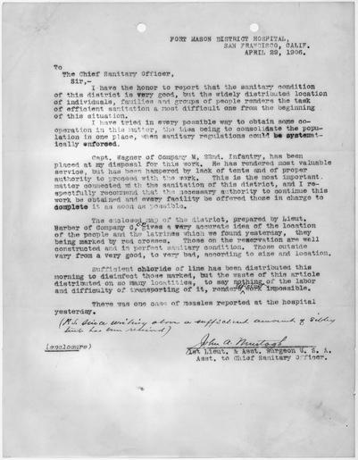 Keywords: Report of the John A. Murtaugh, 1st Lieutenant, Assistant Surgeon USA, Assistant to Chief Sanitary Inspector, sent... - NARA - 296631.tif Scope and content This document pertains to the federal response to the 1906 San Francisco Earthquake and Fire General notes 296631 Local identifier War Department Letterman General Hospital ca 1898 - 09/18/1947 NARA's Pacific Region San Bruno NRHAS 1000 Commodore Drive San Bruno CA 94066-2350 1906-04-29 Record group Record Group 112 Records of the Office of the Surgeon General Army 1775 - 1994 Record group ARC 441 Correspondence and Related Records Pertaining to the San Francisco Earthquake and Fire of 1906 compiled 1906 - 1906 Series ARC 296611 File unit Inspection Reports General Inspections Reports of Special Inspections File unit ARC 296612 Variant control numbers NAIL Control Number NRHS-112-LETGHCORSFEQF1906-INSPGEN-19 yes Other versions NARA-cooperation PD-USGov San Francisco earthquake of 1906 |
