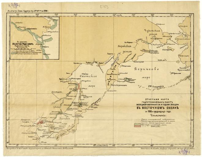 | Keywords: Report Map on the Hydrogeographic Work of Expeditions to the Eastern Ocean and by Squadron Ships in the Eastern Ocean for 1898 and Preceeding Years WDL182.png Artwork ru Главный гид ог афический отдел инисте ства по мо ским делам и ыболовству fr Administration hydrogéographique principale du ministère de la Marine en Kondriakov N zh Kondriakov N pt Kondriakov N ar الإدارة الجغرافية المائية في وزارة الشئون البحرية es Administración Hidrogeográfica Principal del Ministerio de Marina ru Отчетная ка та гид ог афических абот экспедиции Восточного океана и судами эксад ы в Восточном океане за 1898 и п едыдущие года fr Carte de rapports sur les travaux hydrogéographiques des expéditions vers l océan de l'Est et par des navires d escadre dans l océan de l Est en 1898 et pendant les années précédentes en Report Map on the Hydrogeographic Work of Expeditions to the Eastern Ocean and by Squadron Ships in the Eastern Ocean for 1898 and Preceeding Years zh 征 海以及1898年及之前骑兵舰队 海 察记载的水文 理资料报告 图 pt Relatório sobre o Mapa da Obra Hidrogeográfica da expedição ao Oceano Oriental e para Esquadra de Navios no Oceano Oriental para 1898 e anos anteriores ar خريطة تقريرية حول أعمال الجغرافية المائية التي أجرتها البعثات الاستكشافية في المحيط الشرقي والتي قامت بها أسراب السفن في المحيط الشرقي في 1898 وفي السنوات الفائتة ru Гид ог афические ка ты создаются главным об азом для навигационных целей Они также могут использоваться для ыбной ловли океаног афии и п оведения подводных поисков Искусство составления гид ог афических ка т было высоко азвито в РоссииXIXвека; этим занималось о ское министе ство целью кото ого было создавать и постоянно уточнять навигационные ка ты Данная ка тая является частью более к упной аботы озаглавленной <i> Соб ание отчетных ка т гид ог афических абот </i> Соб ание гид ог афических абот и ка т с указанием мест ко аблек ушений на 1898 г в Че ном Азовском Каспийском Белом Балтийском мо ях и некото ых частях Восточного океана и озе а Байкал анесенные на ка ту символы означают исследованные побе ежья побе ежья кото ые не были исследованы с мо я и изме ения п оведенные в 1898 году и п едшествующие годы а ка те обозначены ост ова бухты п оливы мысы подводные скалы и населенные пункты Сп авочная ка та в ве хнем левом углу показывает аботу гид огеог афических исследовательских па тий в устье еки Аму <br>Гид ог афия; Тихий океан fr Les cartes hydrographiques répondent principalement aux besoins des navigateurs et des marins Elles sont également utilisées dans les activités de pêche d'océanographie et de prospection sous-marine La cartographie hydrographique était très développée dans la Russie du XIXe siècle époque à laquelle elle était réalisée par le ministère de la Marine pour créer et continuellement mettre à jour les cartes de navigation Cette carte fait partie d'un plus grand ouvrage intitulé <em>Sobranie otchetnykh kart gidrograficheskikh rabot </em> Collection de cartes de rapports sur les travaux hydrogéographiques et de cartes indiquant les naufrages pour 1898 dans la mer Noire la mer d'Azov la mer Caspienne la mer Blanche la mer Baltique des parties de l'océan de l'Est et de l'océan Arctique et le lac Baïkal Les symboles figurant sur cette carte indiquent les côtes examinées les côtes non encore inspectées depuis la mer ainsi que les dimensions mesurées en 1898 et pendant les années précédentes Les îles les baies les détroits les caps les roches sous-marines et les centres de population sont indiqués sur la carte La carte supplémentaire en haut à gauche montre les travaux d équipes effectuant des levers hydrographiques dans l'embouchure du fleuve Amour <br>Hydrographie; Océan Pacifique en Hydrographic maps mainly serve the needs of navigators and mariners Other uses include fishing oceanography and underwater prospecting Hydrographic mapping was highly developed in 19th-century Russia where it was carried out by the Ministry of Marine to create and constantly update navigational charts This map is from a larger work entitled <i>Sobranie otchetnykh kart gidrograficheskikh rabo</i>t Collection of Report Maps of Hydrogeographic Work and Maps Indicating Shipwrecks for 1898 in the Black Sea Sea of Azov Caspian Sea White Sea Baltic Sea and Parts of the Eastern Ocean and Arctic Ocean and Lake Baikal The symbols on the map indicate coastlines that had been examined coastlines that had not been inspected from the sea and measurements taken in 1898 and in previous years Noted on the map are islands bays straits capes underwater rocks and population centers The supplemental map in the upper left shows the work of hydrogeographic survey parties in the mouth of the Amur River <br>Hydrography; Pacific Ocean zh 水文 图主要用于满