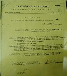 | Keywords: Report of Party Committee about Berzin.jpg ru Выписка из п отокола заседания па ткомиссии п и Политотделе Дальст оя от 8 фев аля 1938 г об исключении Бе зина Э П из ядов ВКП б Из экспозиции агаданского областного к аеведческого музея own Gulag-Museum Magadan Alglus 1938-02-08 PD-old Eduard Petrovich Berzin |