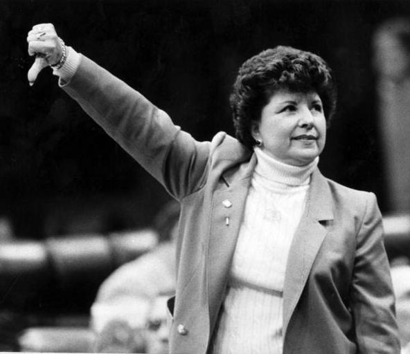 | Keywords: florida state library and archives of florida statelibraryandarchivesofflorida women's history month womenshistorymonth elaine gordon elainegordon florida legislature floridalegislature democrats north miami northmiami tallahassee florida house of representatives floridahouseofrepresentatives politicians florida women's hall of fame floridawomenshalloffame woman thumbsdown legislator 1984 1980s eighties blackandwhite people monochrome black and white Local call number: DND0483 Title: Representative Elaine Gordon votes NO: Tallahassee, Florida Date: December 7, 1984 General note: Gordon was born in the Bronx, New York, but became Florida's "native" daughter. She served in the Florida legislature for 22 years. Gordon distinguished herself through her knowledge of the issues, tireless work, compassion for people and belief in the democratic process. Accompanying note: "Rep. Elaine Gordon (D-North Miami) is seen as she says 'thumbs down' to an amendment which might have blocked passage of the child abuse legislation which she was in favor of." Physical descrip: 1 photoprint - b&w - 8 x 10 in. Series Title: Donn Dughi collection Repository: State Library and Archives of Florida, 500 S. Bronough St., Tallahassee, FL 32399-0250 USA. Contact: 850.245.6700. Archives@dos.state.fl.us Persistent URL: floridamemory.com/items/show/103078 Visit Florida Memory to find resources for Women's History Month and to learn more about the contributions of women in Florida history. Local call number: DND0483 Title: Representative Elaine Gordon votes NO: Tallahassee, Florida Date: December 7, 1984 General note: Gordon was born in the Bronx, New York, but became Florida's "native" daughter. She served in the Florida legislature for 22 years. Gordon distinguished herself through her knowledge of the issues, tireless work, compassion for people and belief in the democratic process. Accompanying note: "Rep. Elaine Gordon (D-North Miami) is seen as she says 'thumbs down' to an amendment which might have blocked passage of the child abuse legislation which she was in favor of." Physical descrip: 1 photoprint - b&w - 8 x 10 in. Series Title: Donn Dughi collection Repository: State Library and Archives of Florida, 500 S. Bronough St., Tallahassee, FL 32399-0250 USA. Contact: 850.245.6700. Archives@dos.state.fl.us Persistent URL: floridamemory.com/items/show/103078 Visit Florida Memory to find resources for Women's History Month and to learn more about the contributions of women in Florida history. |