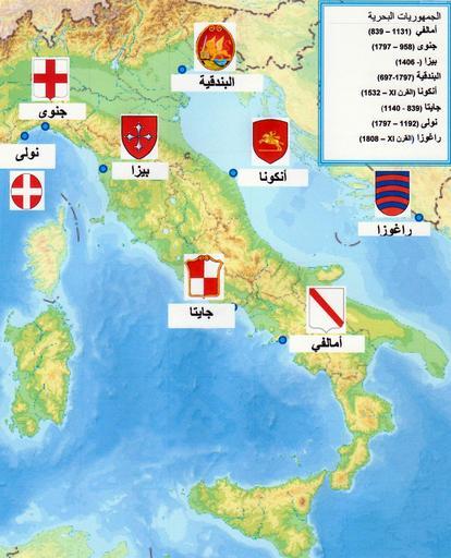 | Keywords: Repubbliche marinare in arabo.jpg en Map of the Maritime Republics in Arabic it Mappa delle repubbliche marinare con didascalie in Arabo Ho fatto io la carta usando come base una mappa tratta da Commons Sono io l'autore 2012-08-20 Amalfi Genova Pisa Venezia Ancona Gaeta Noli Ragusa Croazia Rome Venice Dubrovnik Genoa Cc-zero Maps of Europe |