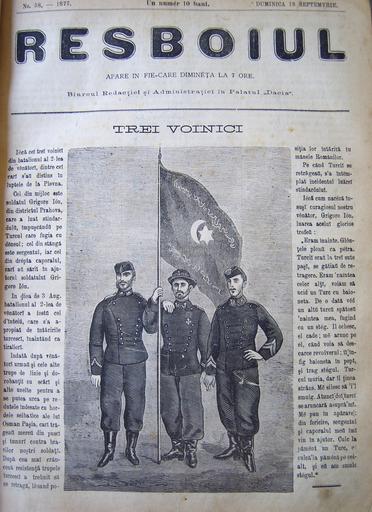 | Keywords: Resboiul-prima-pagina-18-septembrie-1877.jpg  en Front page of magazine Resboiul September 18th 1877 The print depicts three Romanian soldiers of the 1877-1878 Romanian War of Independence with an Ottoman flag captured during the Siege of Plevna 20 July “ 10 December 1877 Transcription of the article original in Romanian Iacă cei trei voinici din Batalionul al 2-lea de vânători dintre cei care s-au distins în luptele de la Plevna Cel din mijloc este soldatul Grigore Ion din districtul Prahova care a luat stindardul împuscându-l pe Turcul care fugea cu dânsul; cel din stânga este sergentul iar cel din dreapta este caporalul care au sărit în ajutorul soldatului Grigore Ion ÃŽn ziua de 3 Aug batalionul al 2-lea de vânători a fost cel dintâi care s-a apropiat de întăririle turceÅŸti înaitând ca tiraliori ÃŽndată după vânători urmau ÅŸi celelalte trupe de linie ÅŸi dorobanÅ£ii cu scări ÅŸi alte unelte pentru a se putea urca pe redutele îndesate cu hordele sălbatice ale lui Osman PaÅŸa care trăgeau mereu cu puÅŸti ÅŸi tunuri contra bravilor noÅŸtri soldaÅ£i După cea mai crâncenă rezistenţă trupele turceÅŸti a trebuit să se retragă lăsând posiÅ£ia lor întărită în mâinile Românilor Pe când Turcii se retrăgeau s-a întâmplat incidentul luărei stindardului Iacă cum narează însuÅŸi curagiosul nostrul vânător Grigore Ion luarea acelui glorios trofeu Eram înainte GlonÅ£ele ploau ca piatra Turcii erau la trei sute de paÅŸi se gătiau de retragere Eram ˜naintea celor alÅ£i voiam să ucid un Turc cu baioneta De o dată văd un alt turc spătos ˜naintea mea fugind cu un steag ÃŽl ochesc el cade; mă arunc pe el când voia să descarce revolverul; îi înfig baioneta în pept ÅŸi trag steagul Turcul muria dar îl Å£inea strâns Mă silesc să ˜i ™l smulg Atunci doi turci se aruncară asupră ™mi Mă pun în apărare; din fericire sergentul ÅŸi caporalul meu îmi vin în ajutor Culc la pământ un Turc ei culcă la pământ pe celălalt ÅŸi eu am smuls steagul 1877-09-18 http //resboiu ro Resboiul other versions PD-old-70-1923 Romanian War of Independence Vânători de Munte |