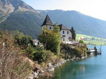 Keywords: reschensee reschen pass reservoir flooded lake alpine bank