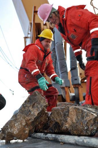 | Keywords: arctic ocean sea ice seaice uscg usgs healy st-laurent stlaurent cutter coast guard coastguard ARCTIC OCEAN - Dr. Alex Andronikov, a geologist from the University of Michigan Department of Geological Science, and Kelley Brumley, a geologist from Stanford University, sort through rocks that were dredged from the Arctic Ocean floor Sept. 9, 2009, aboard the Coast Guard Cutter Healy.The dredging is part of the U.S. Extended Continental Shelf Task Force's effort to locate the outer reaches of the North American continental shelf.(U.S. Coast Guard photo by Petty Officer Patrick Kelley) Photo Credit: Patrick Kelley, U.S. Coast Guard ARCTIC OCEAN - Dr. Alex Andronikov, a geologist from the University of Michigan Department of Geological Science, and Kelley Brumley, a geologist from Stanford University, sort through rocks that were dredged from the Arctic Ocean floor Sept. 9, 2009, aboard the Coast Guard Cutter Healy.The dredging is part of the U.S. Extended Continental Shelf Task Force's effort to locate the outer reaches of the North American continental shelf.(U.S. Coast Guard photo by Petty Officer Patrick Kelley) Photo Credit: Patrick Kelley, U.S. Coast Guard |