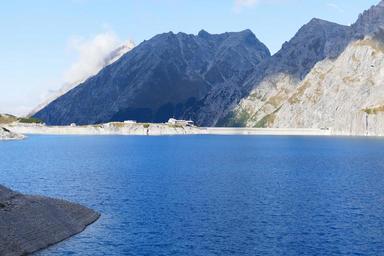 Keywords: reservoir dam lüner lake energy generation mountains lake artificial blue building douglas cottage montafon vorarlberg austria