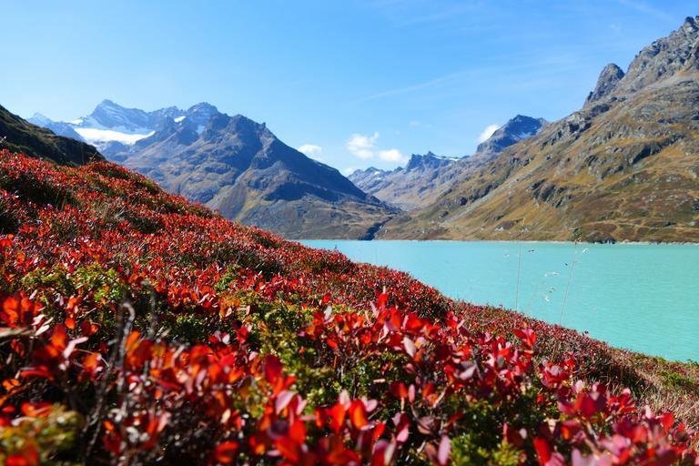 Keywords: reservoir dam silvretta montafon vorarlberg austria water blue green sun mountains alpine autumn