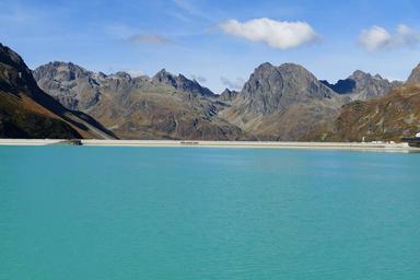 Keywords: reservoir dam silvretta montafon vorarlberg austria water blue green sun mountains alpine