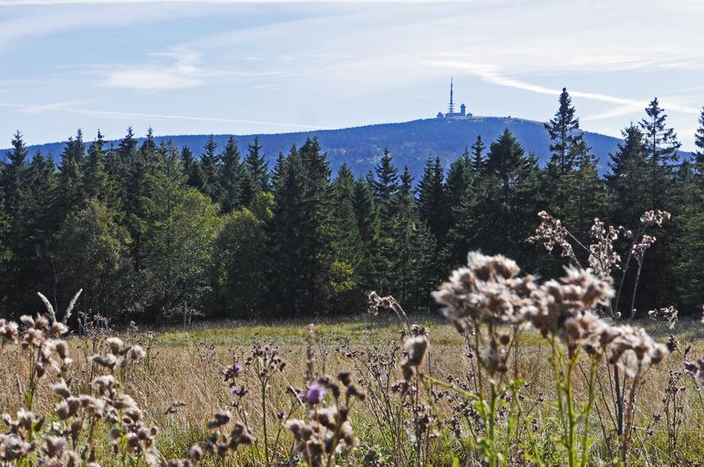 Keywords: resin brocken view torfhaus knoll coniferous forest conifers meadow frühherbst boulder lower saxony saxony-anhalt oberharz national park wild plants high position highlands hiking hiking trails crest tv tower brocken museum fixed point
