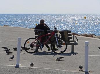 Keywords: rest break mediterranean cape headland strengthening eat pigeons feeding bench bike cannes view distant view seat bread crumbs blackheads bike ride south of france côte d ' azur