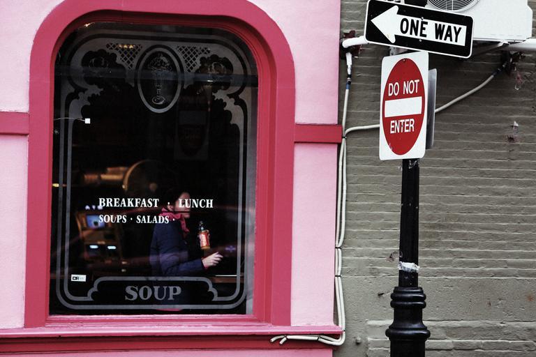 Keywords: restaurant pink window breakfast lunch soups street signs one way post do not enter