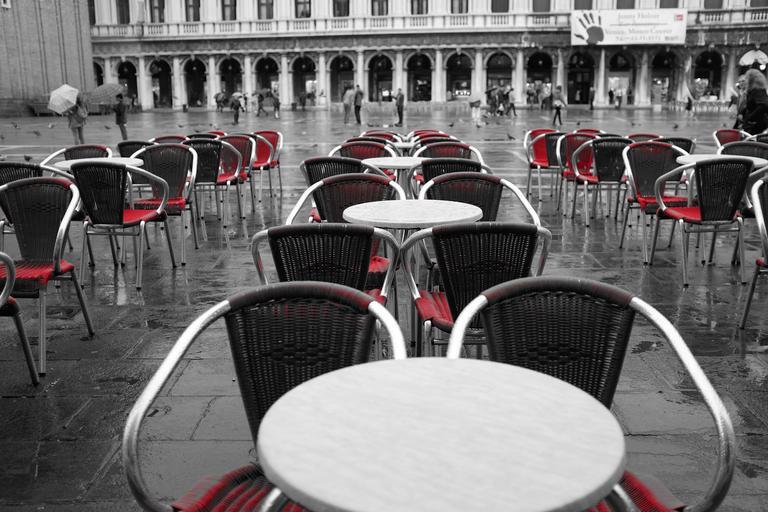 Keywords: restaurant tables chairs terrace patio red black and white piazza san marco venice italy