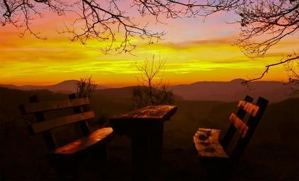 Keywords: resting place picnic sunset bank seating arrangement evening beautiful mood abendstimmung nature landscape twilight color lichtspiel silent rest in the evening atmosphere
