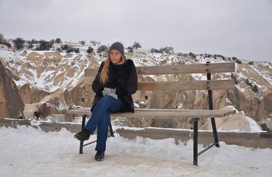 Keywords: resting waiting bank sitting crossed legs female cold girl woman winter nature snow frozen ice sky white winter mood cappadocia