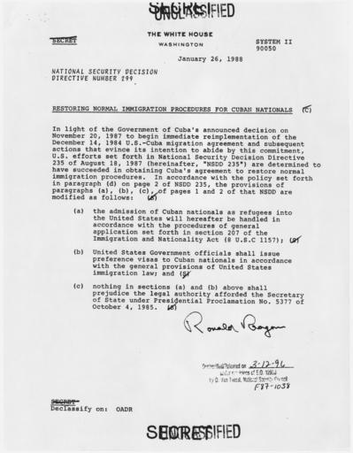 Keywords: Restoring Normal Immigration Procedures for Cuban Nationals - NARA - 198391.jpg Scope and content General notes 198391 Local identifier President 1981-1989 Reagan National Security Council 1981 - 1989 Ronald Reagan Library NLRR 40 Presidential Drive Simi Valley CA 93065-0600 1988-01-26 Record group Collection RR-NSC Numbered National Security Policy Papers 1981 - 1989 Record group ARC 1189 National Security Decision Directives compiled 02/25/1981 - 01/19/1989 Series ARC 198166 File unit File unit ARC Variant control numbers NAIL Control Number NLS-NSC-NSDD-299 Other versions <gallery> File Restoring_Normal_Immigration_Procedures_for_Cuban_Nationals_-_NARA_-_198391 tif tif File Restoring_Normal_Immigration_Procedures_for_Cuban_Nationals_-_NARA_-_198391 jpg jpg </gallery> NARA-cooperation PD-USGov Presidential Decision Directives Reagan |