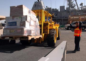| Keywords: Resupply DVIDS49170.jpg en Aviation Machinist's Mate 3rd Class Roman Motos a native of St Petersburg Fla directs the loading of stores and equipment into the upper vehicle storage through the starboard side port aboard USS Bonhomme Richard Bonhomme Richard took on supplies and equipment in Bahrain in case U S forces are called upon to assist in humanitarian assistance or disaster relief efforts in areas affected by Cyclone Gonu 2007-06-07 LHD 6 https //www dvidshub net/image/49170 070607-N-+++++-009 2007-07-06 07 32 ABOARD USS BONHOMME RICHARD BH PD-USGov-Military-Navy USS Bonhomme Richard LHD-6 Images from DoD uploaded by Fæ |