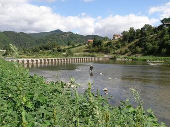 | Keywords: Retournac Barrage4.JPG Retournac dép de la Haute-Loire France Auvergne Pont-barrage submersible sur la Loire qui coule de droite à gauche à env 1km en aval de Retournac au nord-est de la localité Les maisons au second plan à droite appartiennent au hameau de la Navette comm de Retournac Le sommet à l'horizon au centre gauche de la photo est la montagne de la Madeleine comm de Retournac Contre le bord gauche de la photo première travée du pont à arches de la voie ferrée Le Puy ” Saint-Étienne own Torsade de Pointes Août 2009 Pont-barrage de Retournac Retournac |