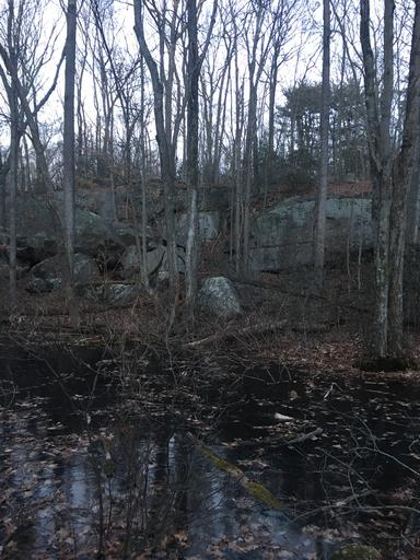 | Keywords: I decided to get out of the swamp area and get back to the trail. Following this trail, I noticed this very impressive rock cliff. I am blocked by a body of water. I will try to cross this body of water to see the rock cliff. glacial guilford connecticut brianghilliotti |