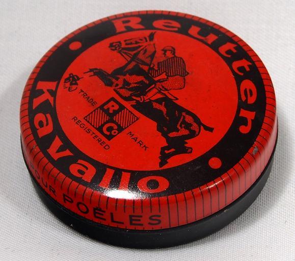 | Keywords: Reutter Kavallo Horse Shoe Polish Tin 1930s picture 4.JPG Very old packaging of a Dutch product that is not produced and not sold any more Photographed at a collector of Droste For info see http //www tincollectors nl/ tincollectors nl or email info tincollectors nl own 2014-06-15 11 28 54 Alf van Beem CC-Zero Trademarked Shoe polish tins |