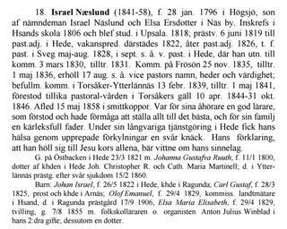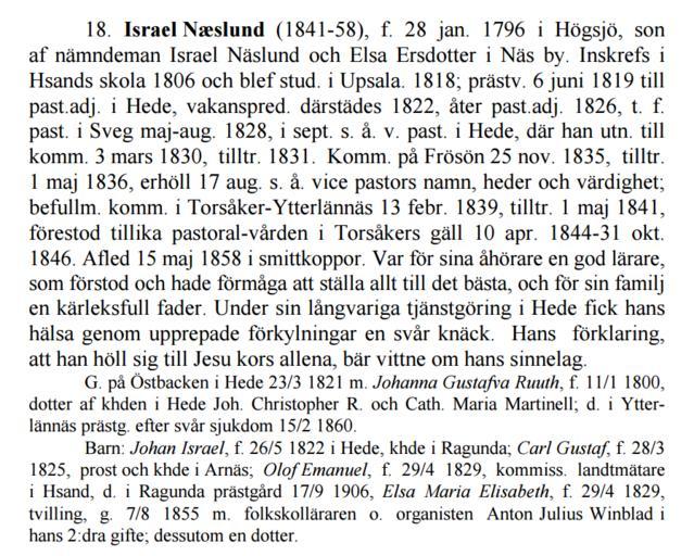 | Keywords: Reverend Israel Israelsson Näslund III (1796-1858) ecclesiastical biography by Leonard Bygdén.png Israel Israelsson Näslund III 1796-1858 ecclesiastical biography by Leonard Bygdén 1844-1929 1922 Hernösands Stifts Herdaminne Leonard Bygdén other versions Swedish text Komministrar i Ytterlännäs<br> 18 Israel Næslund 1841-1858 f 28 jan 1796 i Högsjö son af nämndeman Israel Näslund och Elsa Ersdotter i Näs by Inskrefs i Hsands skola 1806 och blef stud i Upsala 1818; prästv 6 juni 1819 till past adj i Hede vakanspred därstädes 1822 åter past adj 1826 t f past i Sveg maj-aug 1828 i sept s å v past i Hede där han utn till komm 3 mars 1830 tilltr 1831 Komm på Frösön 25 nov 1835 tilltr 1 maj 1836 erhöll 17 aug s å vice pastors namn heder och värdighet; befullm komm i Torsåker-Ytterlännäs 13 febr 1839 tilltr 1 maj 1841 förestod tillika pastoral-vården i Torsåkers gäll 10 apr 1844-31 okt 1846 Afled 15 maj 1858 i smittkoppor Var för sina åhörare en god lärare som förstod och hade förmåga att ställa allt till det bästa och för sin familj en kärleksfull fader Under sin långvariga tjänstgöring i Hede fick hans hälsa genom upprepade förkylningar en svår knäck Hans förklaring att han höll sig till Jesu kors allena bär vittne om hans sinnelag G på Östbacken i Hede 23/3 1821 m Johanna Gustafva Ruuth f 11/1 1800 dotter af khden i Hede Joh Christopher R och Cath Maria Martinell; d i Ytterlännäs prästg efter svår sjukdom 15/2 1860 <br> Barn Johan Israel f 26/5 1822 i Hede khde i Ragunda; Carl Gustaf f 28/3 1825 prost och khde i Arnäs; Olof Emanuel f 29/4 1829 kommiss landtmätare i Hsand d i Ragunda prästgård 17/9 1906 Elsa Maria Elisabeth f 29/4 1829 tvilling g 7/8 1855 m folkskolläraren o organisten Anton Julius Winblad i hans 2 dra gifte; dessutom en dotter English translation Co-minister of Ytterlännäs<br> He was for his audience a good teacher that understood and had the ability to put all to its best and for his family he was a loving father During his long term service in Hede his health through repeated colds became bad His explanation that he only held himself to the cross of Christ shows what kind of temperament he had He was married at Östbacken in Hede on March 23 1821 to Johanna Gustafva Ruuth She was born on January 11 1800 the daughter of the reverend in Hede John Christopher Ruth and Catherine Maria Martinell Johanna died in Ytterlännäs vicarage from a difficult sickness on February 15 1860 Children Johan Israel Näslund born May 26 1822 in Hede minister in Ragunda; Carl Gustaf Näslund born March 28 1825 assistant-minister and then minister in Arnäs; Olof Emanuel Näslund born April 29 1829 land surveyor in Härnösand died at Ragunda vicarage September 17 1906; Elsa Maria Elisabeth Näslund born 29 April 1829 a twin of Olof married August 7 1855 to teacher and organist Anton Julius Winblad in his second marriage Website http //www solace se/~blasta/herdamin/torsaker pdf PD-old PD-1996 Uploaded with UploadWizard Israel Israelsson Näslund Leonard Bygdé |