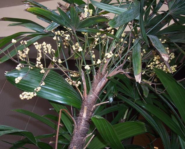 | Keywords: Rexcelsafruit.JPG Three fruiting branches on a female Rhapis excelsa I noticed in Ybor City - Tampa Fl Organs are branched to two orders emerging within the leaf crown; the small white fruit develop from one or rarely two or three carpels The mesocarp is fibrous and fleshy the endocarp thin and brittle The small seeds sprout via remote tubular germination with a slender undivided eophyll own Mmcknight4 Rhapis excelsa | ||||