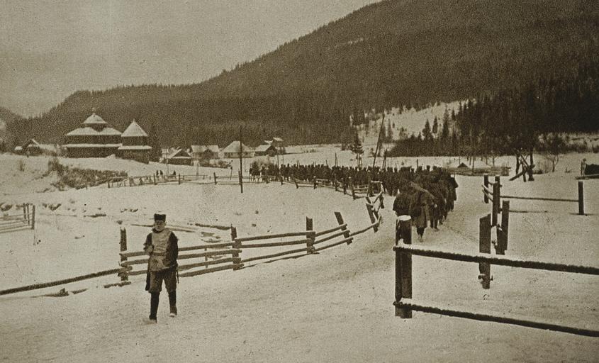 | Keywords: Rezerwy II Brygady Legionów Polskich w drodze na pozycje (01).jpg pl Rezerwy II Brygady Legionów Polskich w drodze na pozycje Po lewej stronie widoczna drewniana cerkiew w Rafajłowej Styczeń 1915 r za Legenda Legionów s 60 1915-01 http //polona pl/item/5935026/0/ Biblioteka Narodowa; syg Poczt 11295 Stanisław Janowski 1866-1942 other versions Custom license marker 2014 10 07 PD-old Uploaded with UploadWizard Photographs by Stanisław Janowski II Brygada Legionów Polskich Battle of Rafajlova World War I in January 1915 |